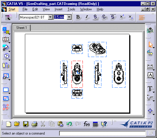 The GenDrafting_part.CATDrawing document opens as shown below: |